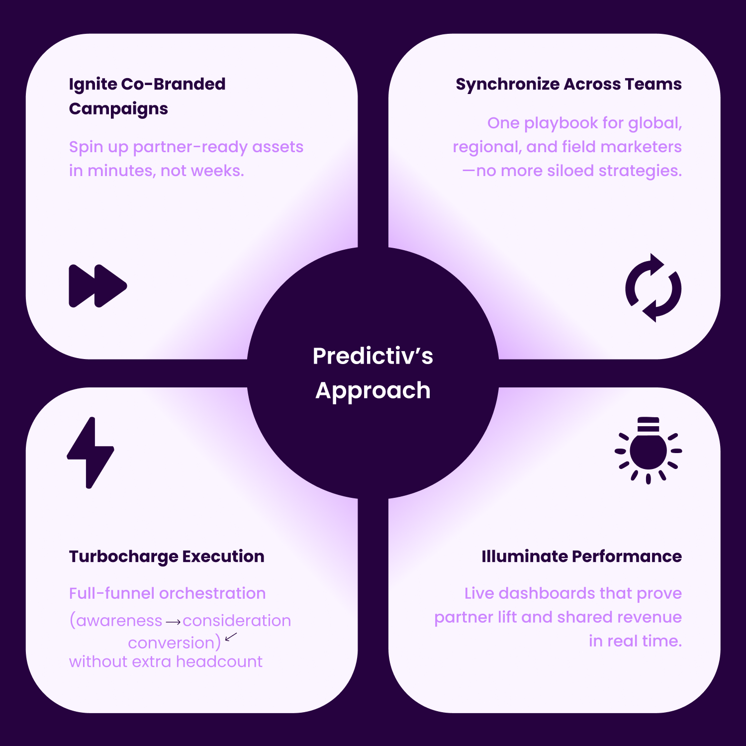 Stop letting partner potential die in execution purgatory. Predictiv helps you turn co-marketing ideas into live campaigns, fast—with the data, execution, and attribution needed to drive shared revenue and repeat success.